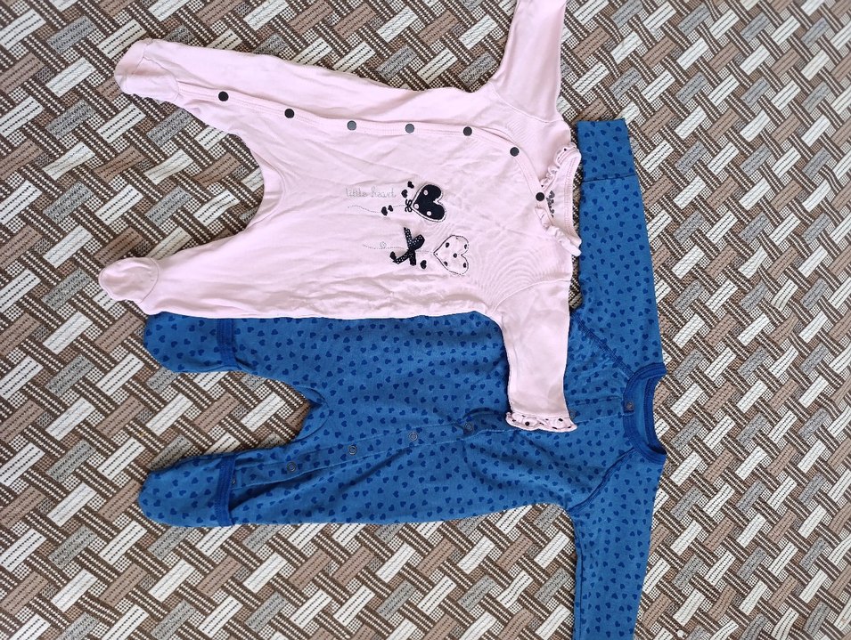 1-3 ay Renkli baskılı, düğmeli bebek kız tulumları. Biri kalp ve harf baskılı pembe, diğeri küçük kalp desenli mavi renkte. Bir tanede kendimden tulum koyacağım