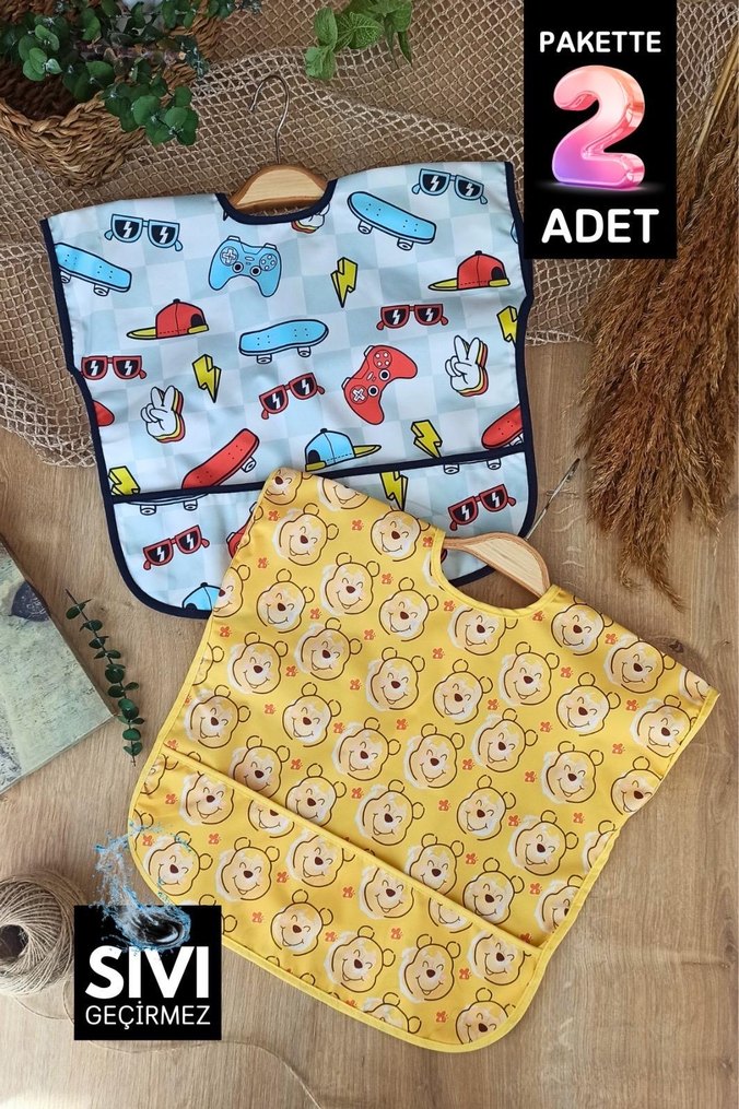 Renkli baskılı 2'li bebek önlüğü seti, sıvı geçirmez özelliğe sahip olup, cepli tasarımı ile döküntüleri toplar.