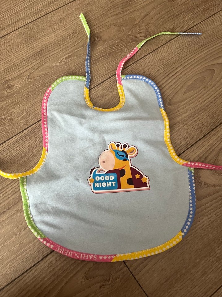 Bağlamalı, renkli kenarları olan ve üzerinde 'GOOD NIGHT' yazılı zürafa baskısı bulunan renkli bebek önlüğü.