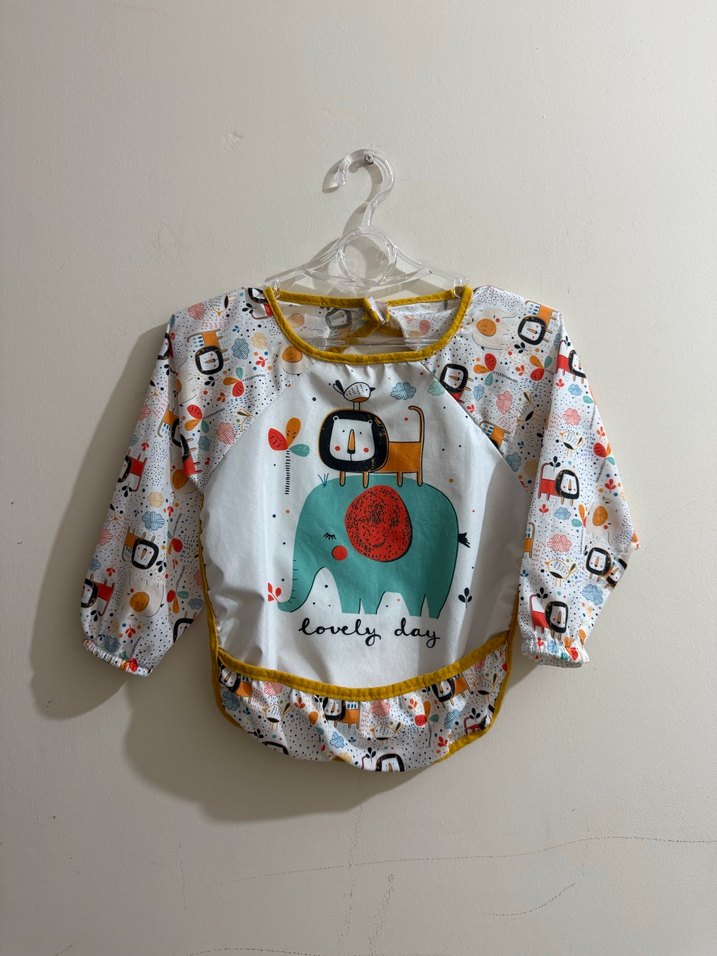 Renkli baskılı, uzun kollu bebek önlüğü. Lastikli manşetleri ve fırfırlı alt kenarı ile yemek sırasında kıyafetleri korur.