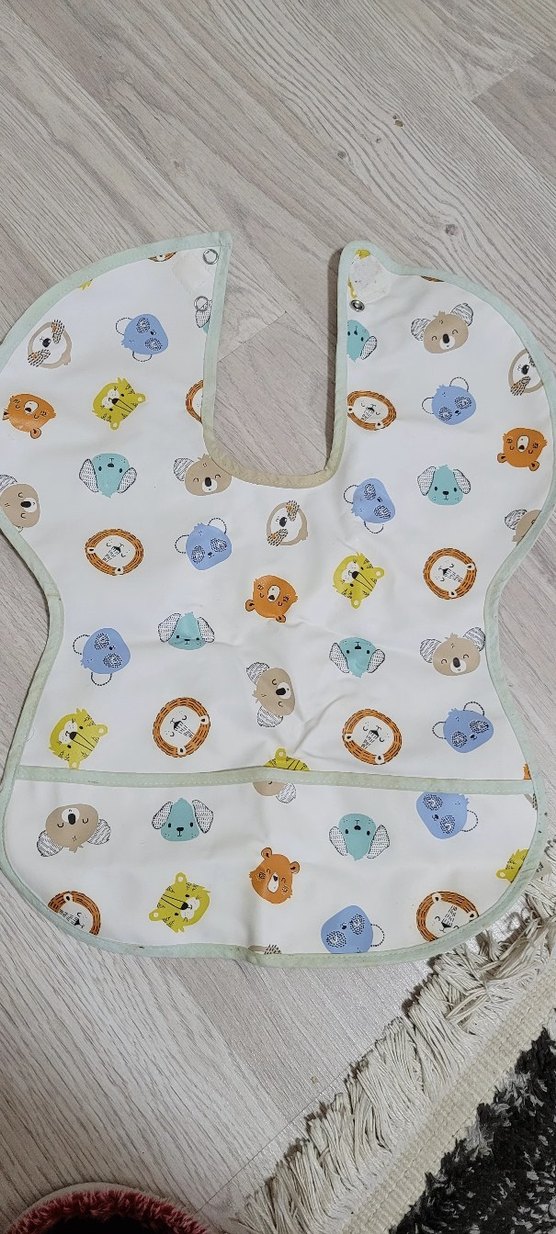 Çeşitli hayvan yüzleri desenli, renkli baskılı bebek önlüğü. Göğsü kapatan yuvarlak şekilli ve çıtçıtlıdır.