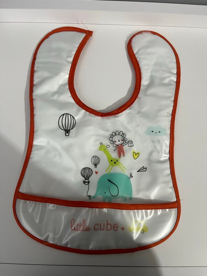 Renkli baskılı desenlere sahip, döküntüleri yakalamak için cepli beyaz zeminli, turuncu kenarlıklı bebek önlüğü.