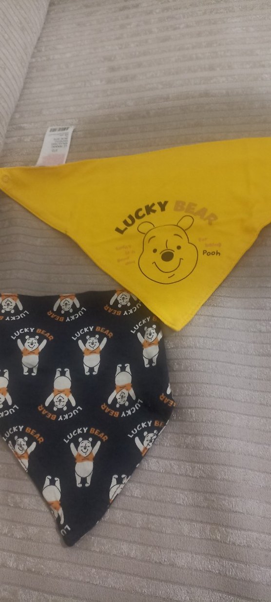 Renkli baskılı ayı desenli bebek önlükleri, sarı olan üzerinde Pooh karakteri bulunur. Yumuşak ve rahat bebeklere uygun. LCW Waikiki ürünü sıfır kullanılmadı 2 adet