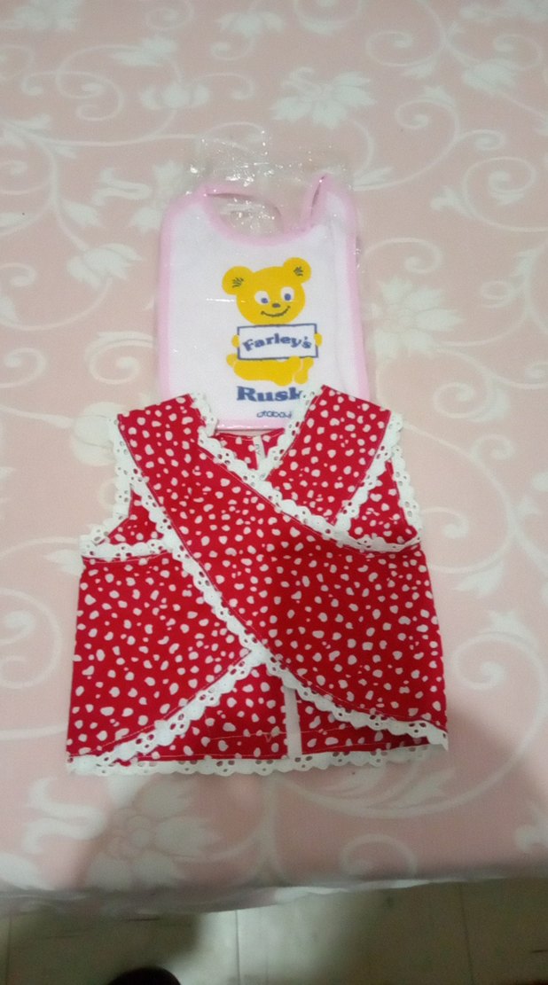 Renkli baskılı, kırmızı bebek önlüğü. Üzerinde "Rusi" yazan yumuşak ve rahat bir tasarıma sahiptir.