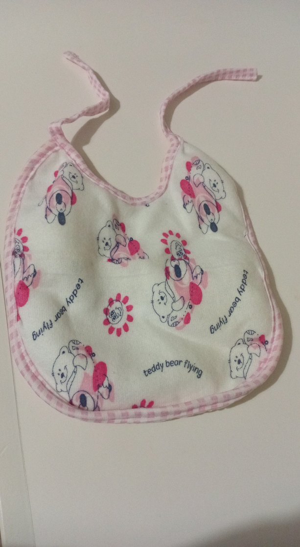 Renkli baskılı ayıcık desenli, pembe kenarlıklı, bağlamalı yumuşak bebek önlüğü.