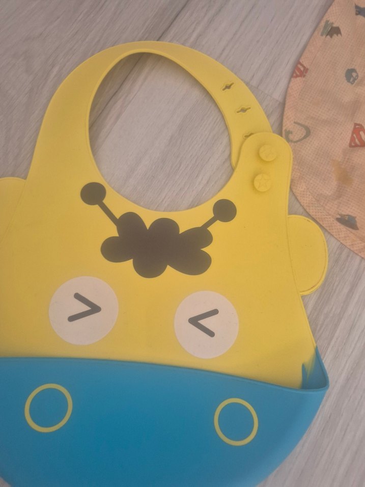 Sarı ve mavi renklerde, baskılı sevimli yüz deseni ve ayarlanabilir düğmeli renkli bebek önlüğü. ve yanında zamanın önlüğü biraz lekeleri var ama belli olmuyor ikisinin fiyatı