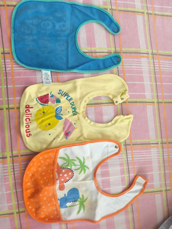 Meyve ve hayvan baskılı, renkli bebek önlükleri. Bir önlük üzerinde "delicious" yazısı bulunur. Kolay kapanır ve temizlenir. çıtçıtlı mama bebek önlüğü.ek gıda döneminde çok işimize yaradı yazısı biraz gitmiş ama üç tanesinin arkası muşamba,naylon yani leke tutmuyor su geçirmiyor.son resimdeki hediye