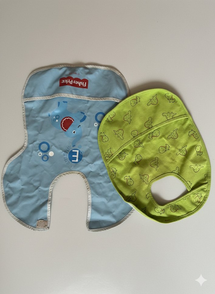 Mavi ve yeşil renklerde, baskılı desenlere sahip iki renkli bebek önlüğü. Boyun çevresine rahatça oturur.