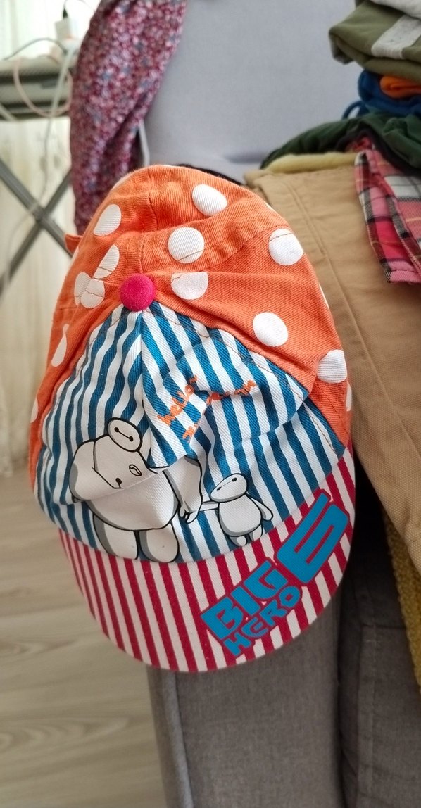 Renkli ve baskılı desenlere sahip, çizgili ve puantiyeli desenlerle süslenmiş bebek şapkası.