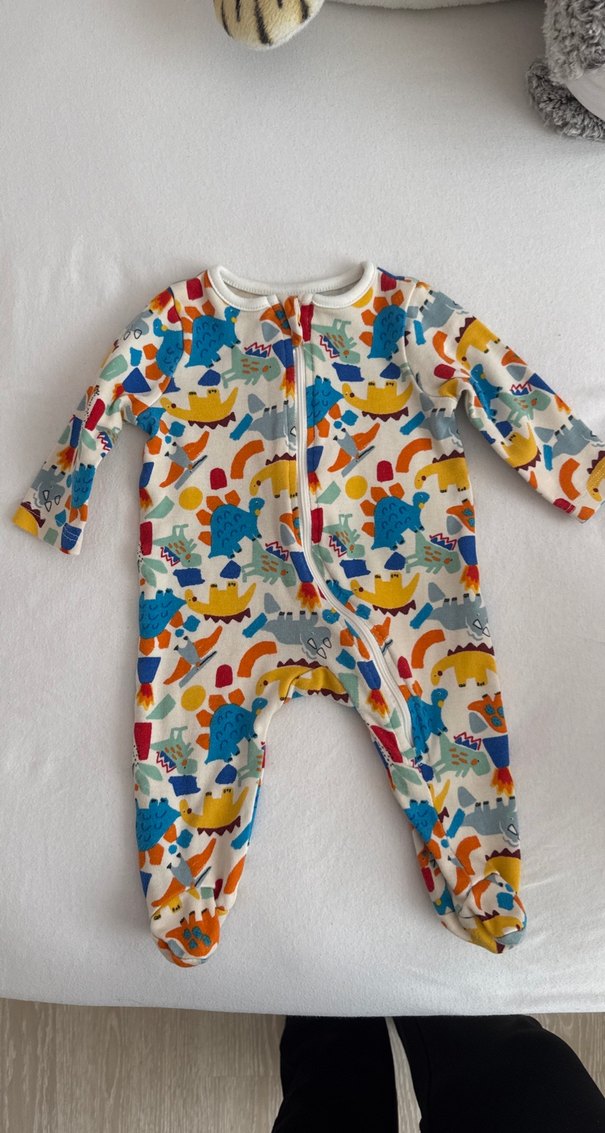 Renkli baskılı, uzun kollu, önü fermuarlı bebek tulumu. Yumuşak ve sıcak kumaştan, eğlenceli pop kültür desenli. Kullanılmadı, yıkandı ütülendi.