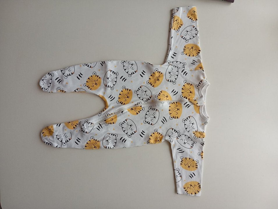 Uzun kollu, yuvarlak yaka, yumuşak sentetik kumaştan yapılmış, renkli kaplan baskılı bebek tulumu.