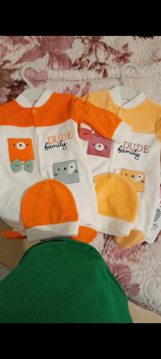 Yumuşak ve sıcak kumaştan yapılmış, renkli baskılı hayvan desenleri ve "DUDE family" yazılı bebek tulumu ve şapka seti.