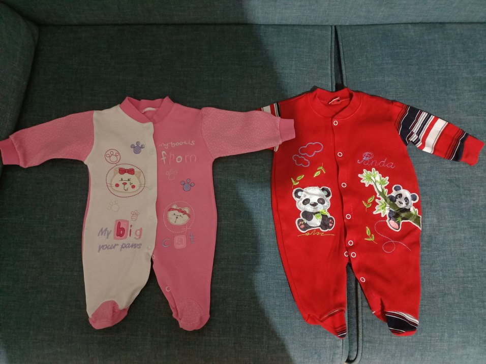 Yumuşak ve sıcak kumaştan yapılmış renkli baskılı bebek tulumları. 0-3 ay yeniden farksız