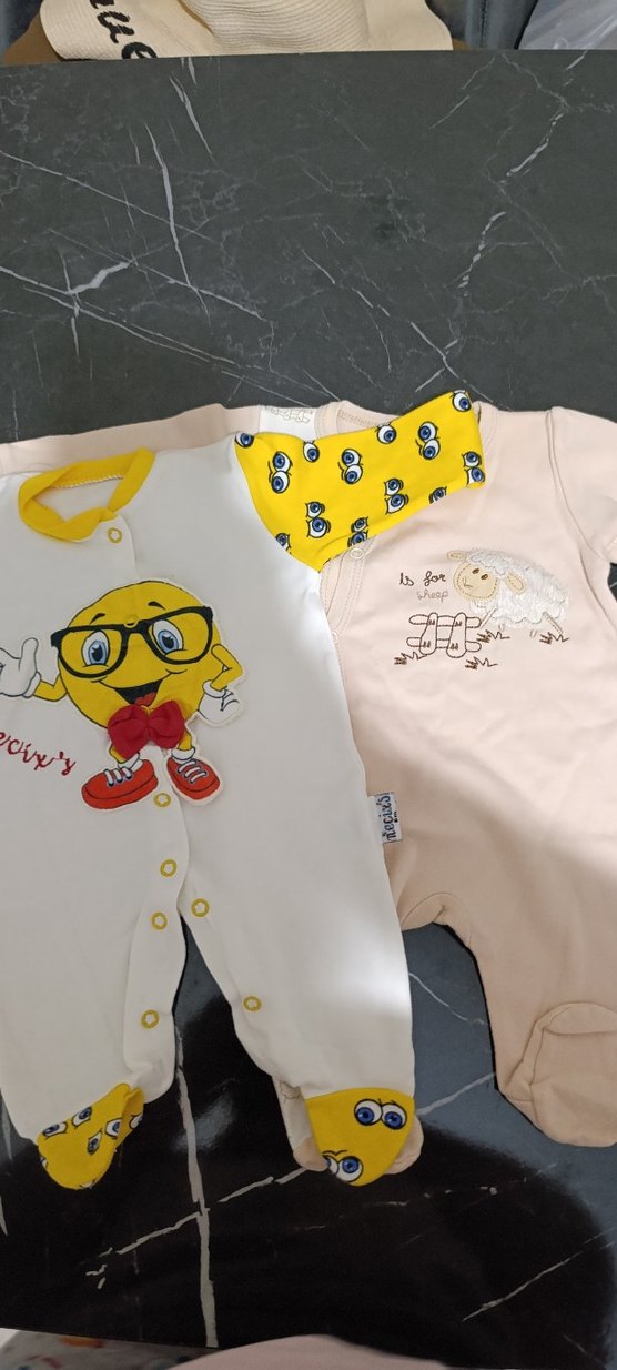 , renkli baskılı bebek tulumları ve sarı desenli uyumlu maske. Bebekler için rahat ve şık.