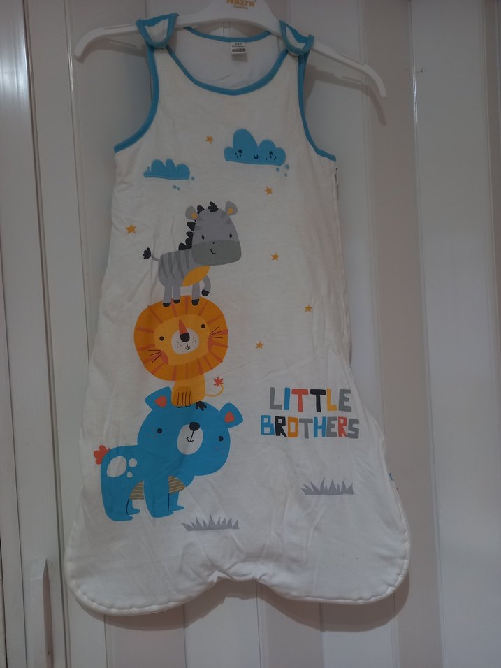 Yumuşak ve sıcak kumaştan yapılmış, renkli baskılı bebek uyku tulumu, sevimli hayvan figürleri ve "LITTLE BROTHERS" yazısı ile.