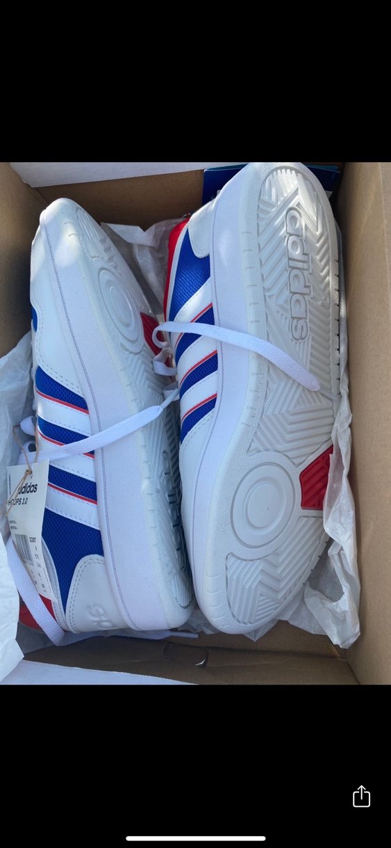 Beyaz, mavi ve kırmızı detaylı renkli baskılı Adidas ayakkabısı,kauçuk taban ve cırt cırtlı bant ile spor ve sokak tarzını birleştiriyor.41 numaraya da olur.