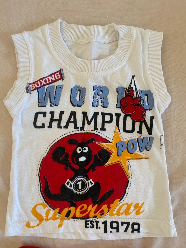 Renkli baskılı beyaz çocuk atlet, boks temalı baskılar ve yazılar içerir. Tertemiz sıfırdır.