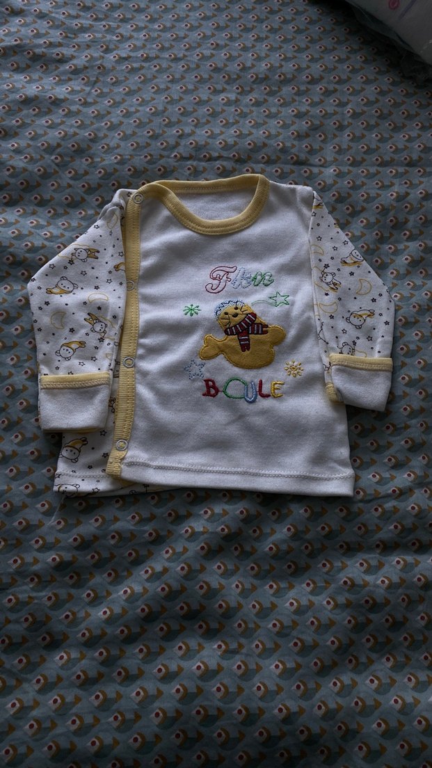 Renkli baskılı beyaz bebek içlik, sevimli ayı figürü ve 'BCULE' yazısı ile. Kolay giyme için çıtçıtlıdır.