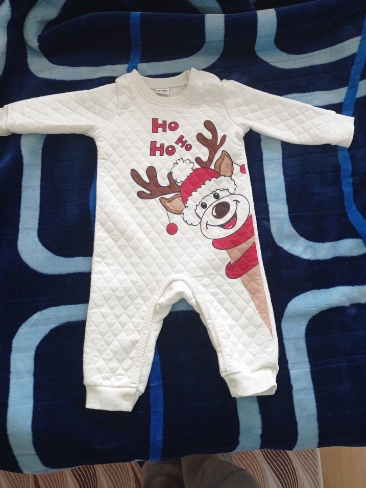 Renkli geyik baskılı beyaz bebek tulumu, uzun kollu ve yuvarlak yakalıdır. Yumuşak örme dokusuyla rahattır. 0-6 ay içindir deforme leke yoktur kapitone kumastir
