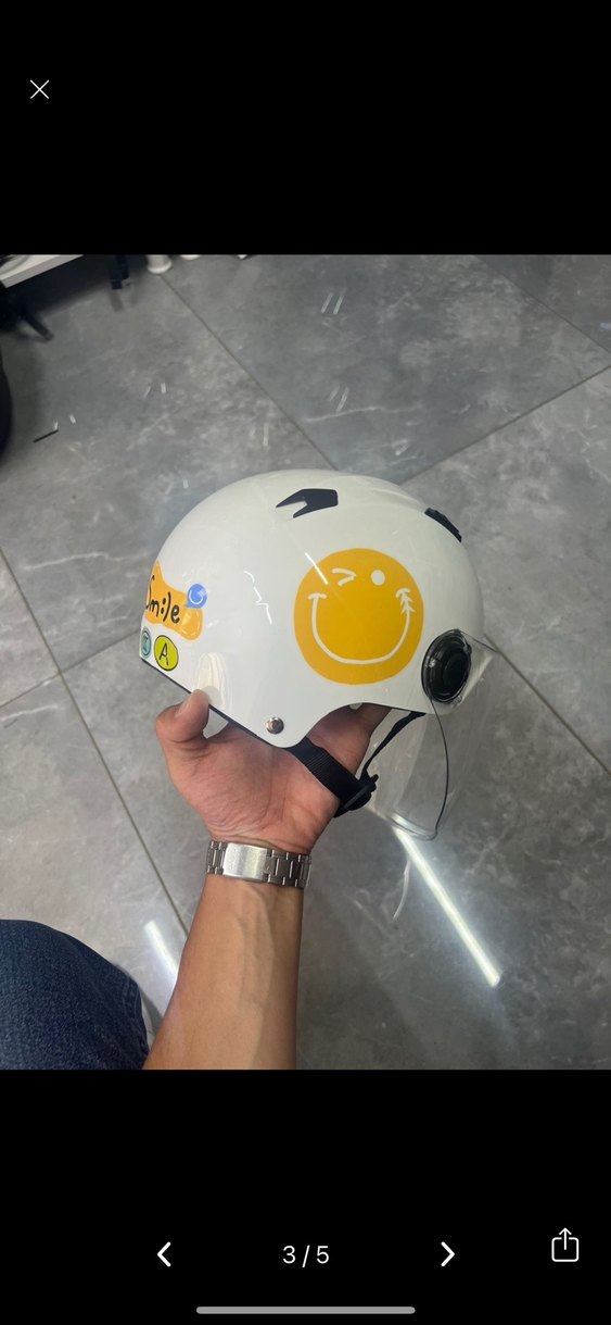 Renkli baskılı gülen yüz desenleri ve cırt cırtlı özelliği olan beyaz biker motosiklet kaskı. Dayanıklı plastikten, şeffaf vizörlü.güneş gözlüklü.