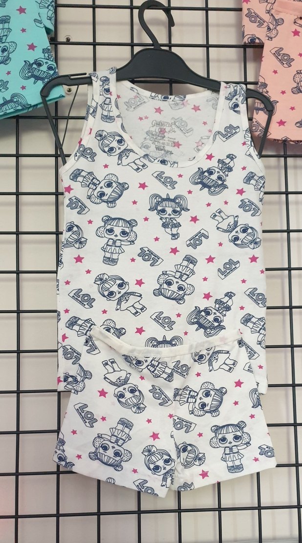 Renkli baskılı beyaz çocuk atlet ve şort takımı, sevimli çizgi karakterler ve yıldız desenleri içerir. Üstte 'A' harfi bulunur.