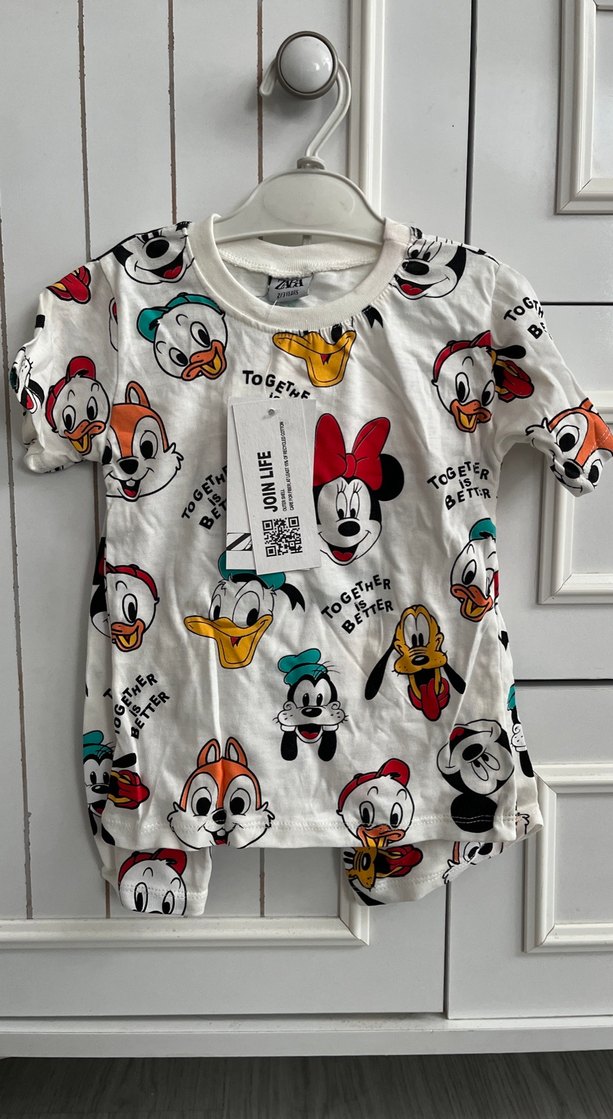 Renkli çizgi film karakterleriyle baskılı, yumuşak kumaştan beyaz çocuk takım. Rahat kullanım için uygundur.