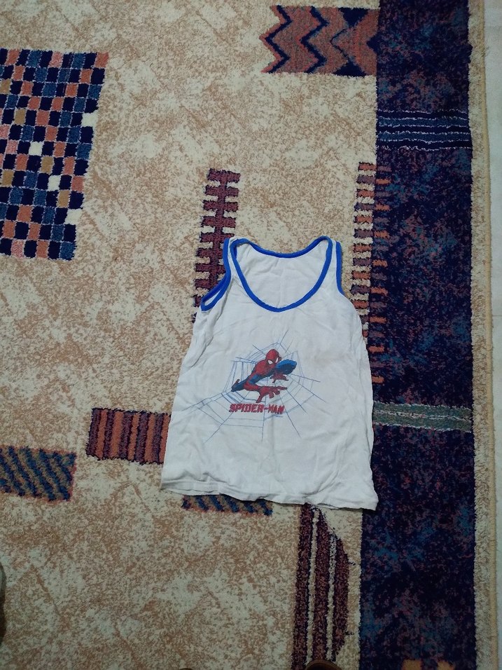 Beyaz renkli, Spider-Man baskılı ve mavi yakalı erkek çocuk atlet. Rahat ve günlük kullanıma uygun. ️