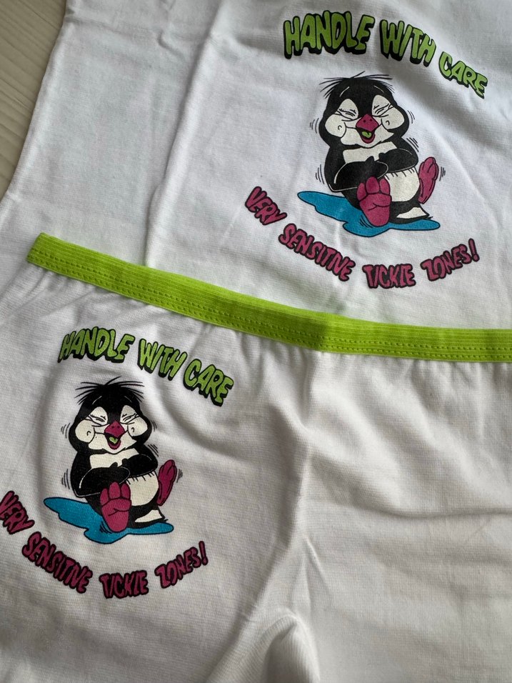 Renkli baskılı çizgi karakterler ve yeşil detaylı beyaz iç çamaşırı. Kumaşı yumuşak ve rahattır, üzerinde 'SENSITNE' yazısı bulunur.
