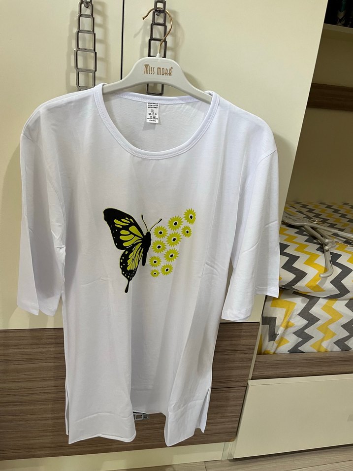 Pamuklu beyaz tişört, renkli kelebek ve çiçek baskılıdır. Kısa kollu, yuvarlak yaka ve salaş, kısa kesimdir.