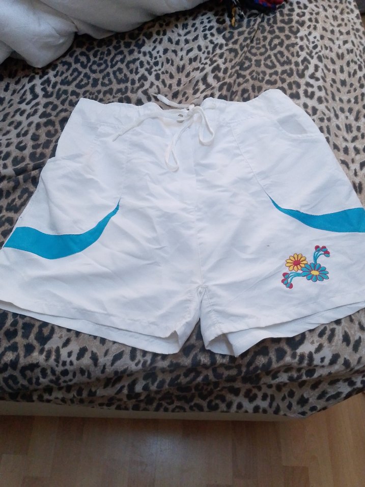 Rahat kesim beyaz mini şort, renkli baskılar ve düğme detayları bulunur. Yumuşak pamuklu kumaştan, plaj ve günlük sokak stili için uygundur.