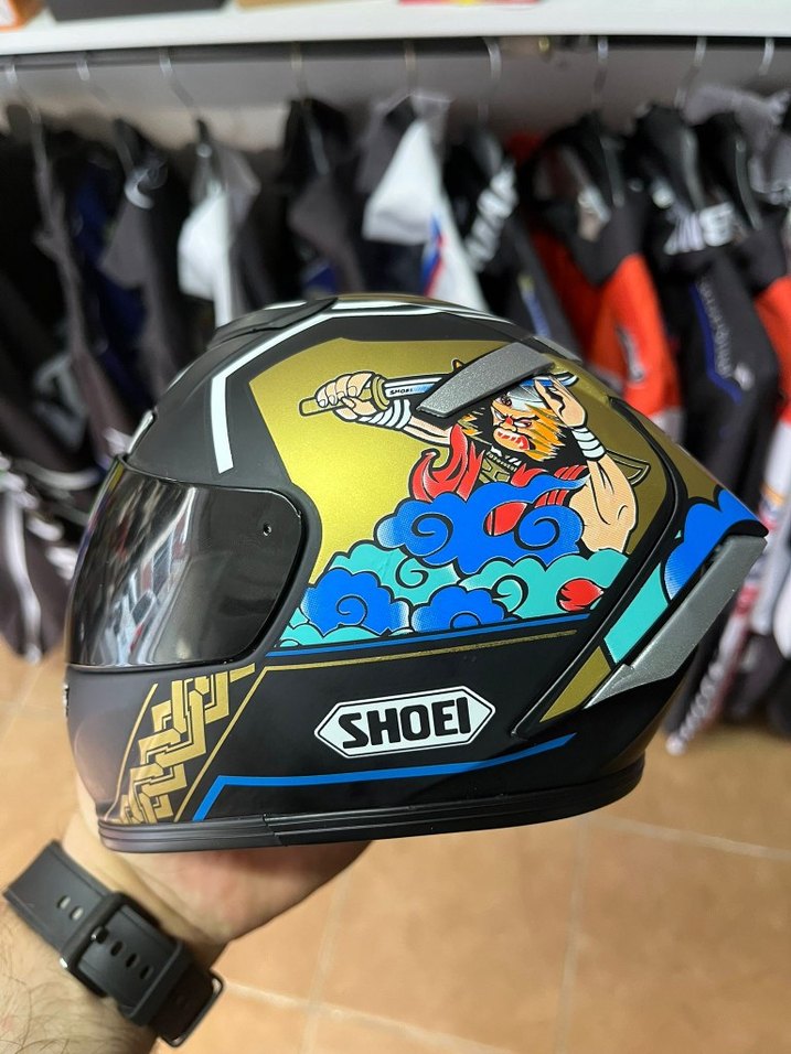 Renkli baskılı, tokalı ve kauçuk malzemeden yapılmış biker motosiklet kaskı. SHOEI logosu bulunur, sokak tarzı rock punk havası verir. ️