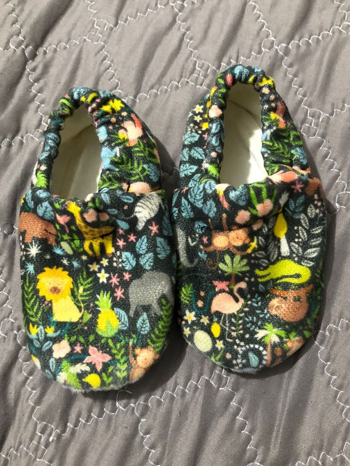 Renkli baskılı tekstil malzemeden, düğmeli bohem tarzda erkek bebek patik. fotoğrafta görüldüğü gibi.