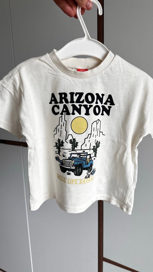 Pamuk kumaştan üretilmiş, bohem tarzı renkli Arizona Canyon baskılı, beyaz erkek çocuk tişörtü. Geniş kesim ve yuvarlak yakaya sahiptir.