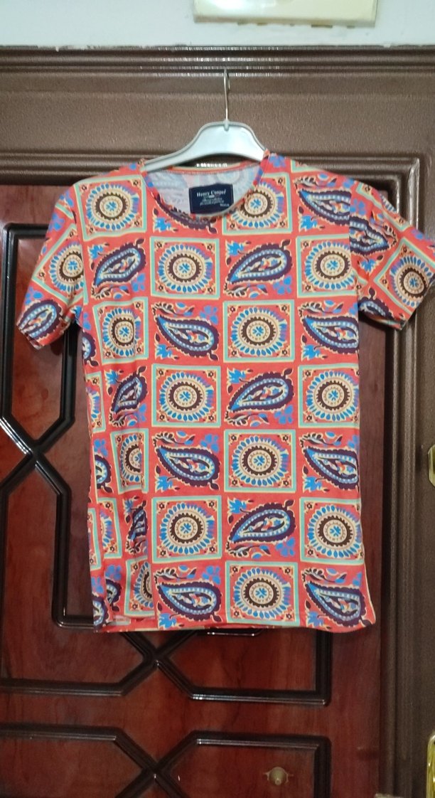 Bu erkek tişörtü, bol kesim, bisiklet yaka ve kısa kolludur. Sentetik kumaştan üretilmiş olup, renkli baskılı bohem desenlere sahiptir.