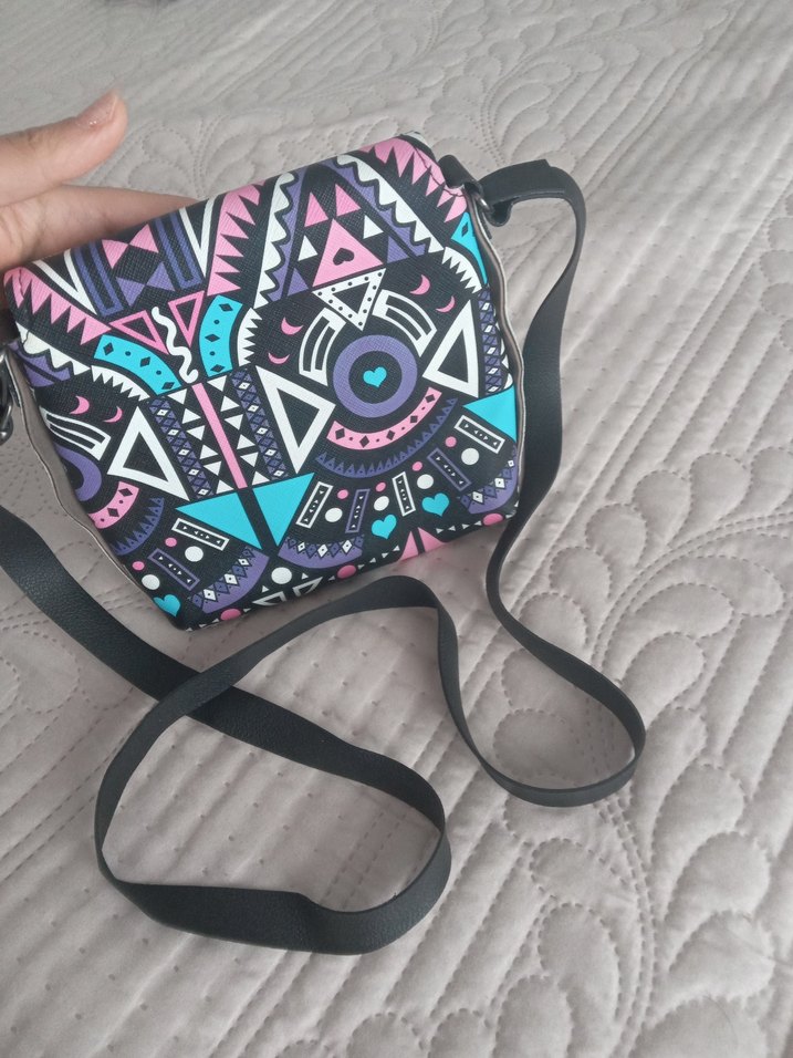 Bu kadın çantası, renkli baskılı deseni, tokalı kapağı ve siyah ayarlanabilir askısıyla sentetik kumaştan yapılmıştır. Günlük kullanım için bohem ve sokak stiline uygun.
