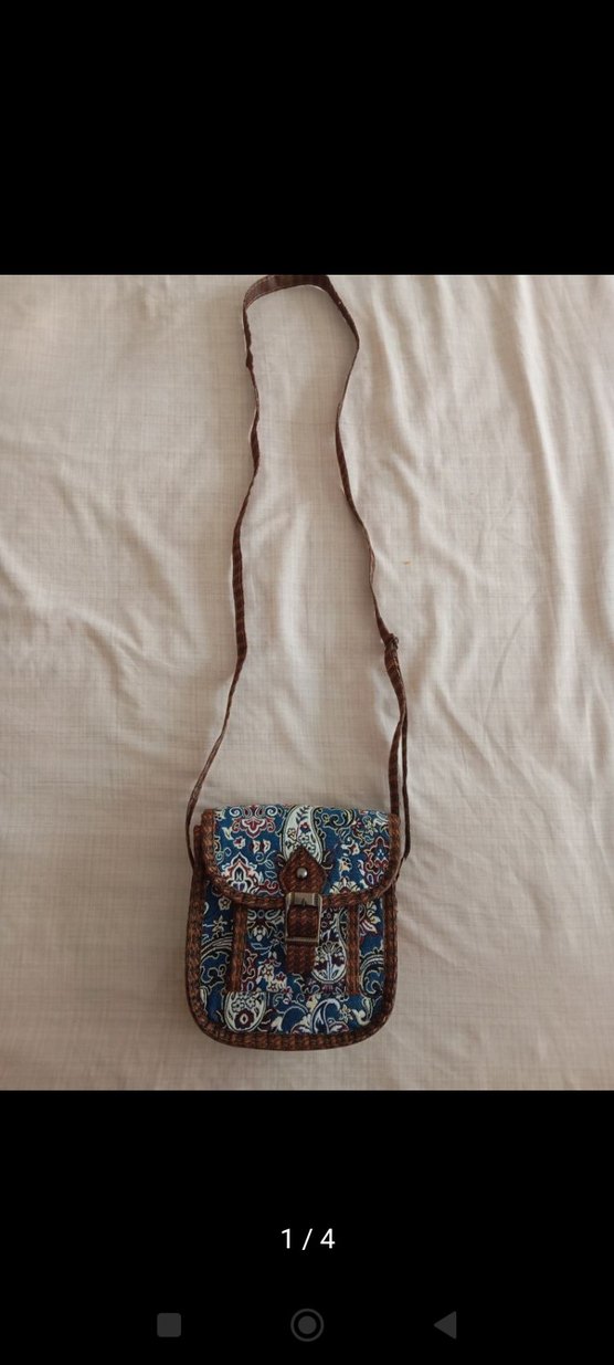 Renkli baskılı tekstil malzemeden yapılmış, tokalı kapaklı ve uzun askılı kadın çantası, günlük kullanıma uygundur.