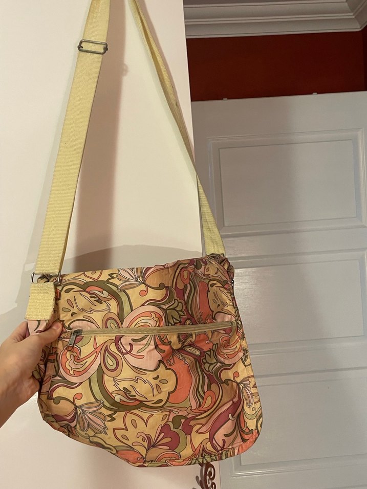 Bohem tarzda, çok renkli baskılı, fermuarlı kadın çantası. Yumuşak sentetik kumaştan, pastel tonlu askılı, günlük kullanıma uygun.