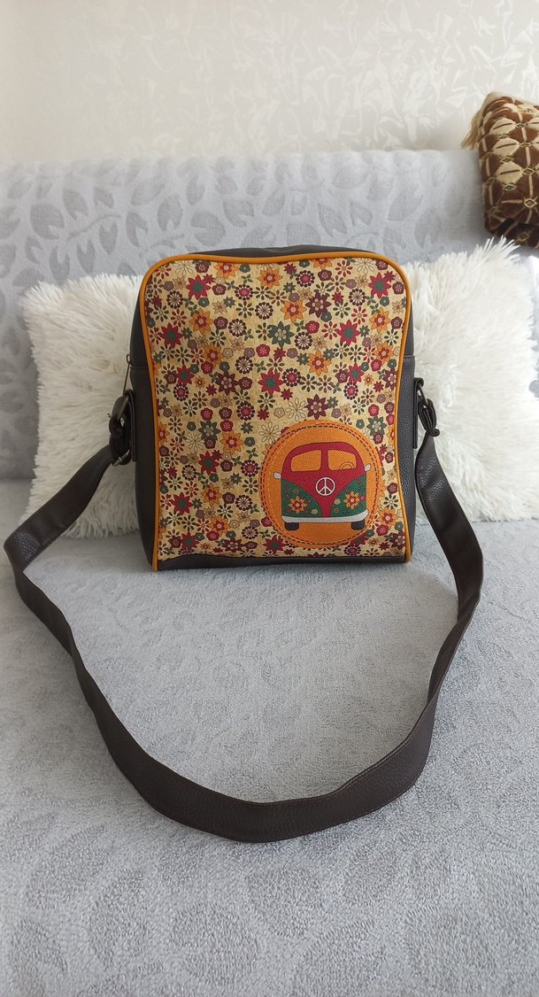Sentetik kumaştan üretilmiş, renkli baskılı ve fermuarlı uzun askılı bu çanta, retro otobüs desenleri ve canlı çiçek motifleriyle günlük kullanıma uygundur. boyutu 24cm en 29cm boy