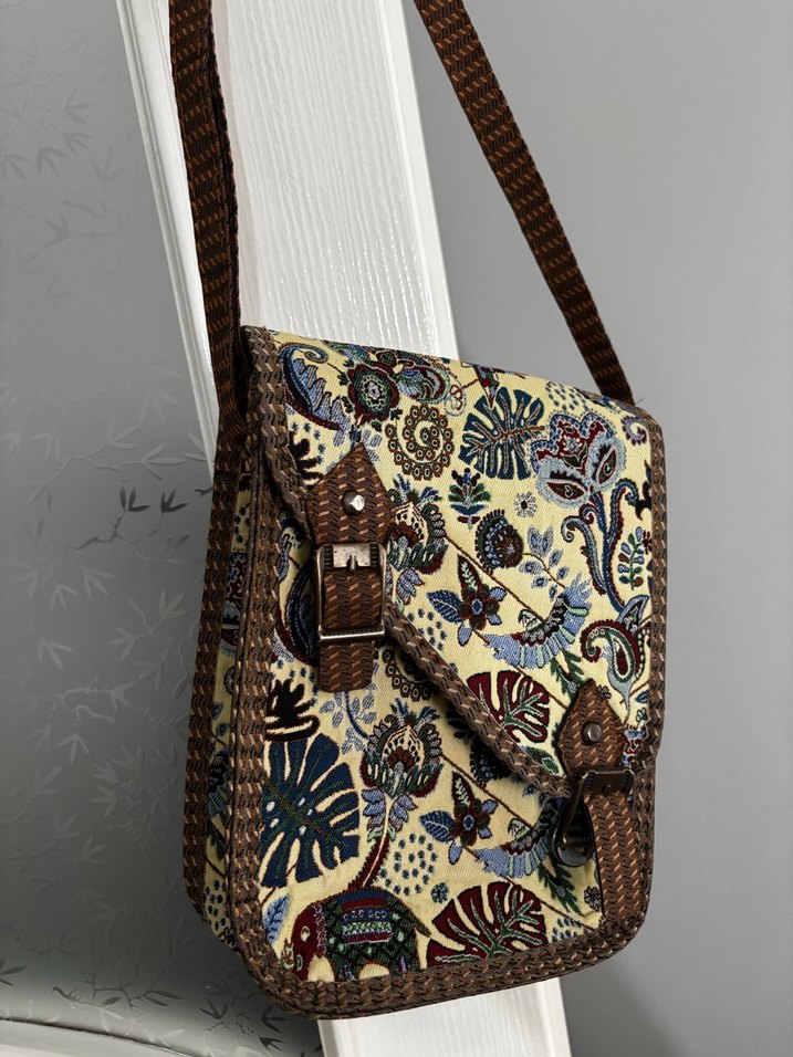 Kahverengi sentetik kumaştan, renkli baskılı ve tokalı bohem kadın omuz çantası. Günlük kullanıma uygun örgü askılı ve kapaklı.