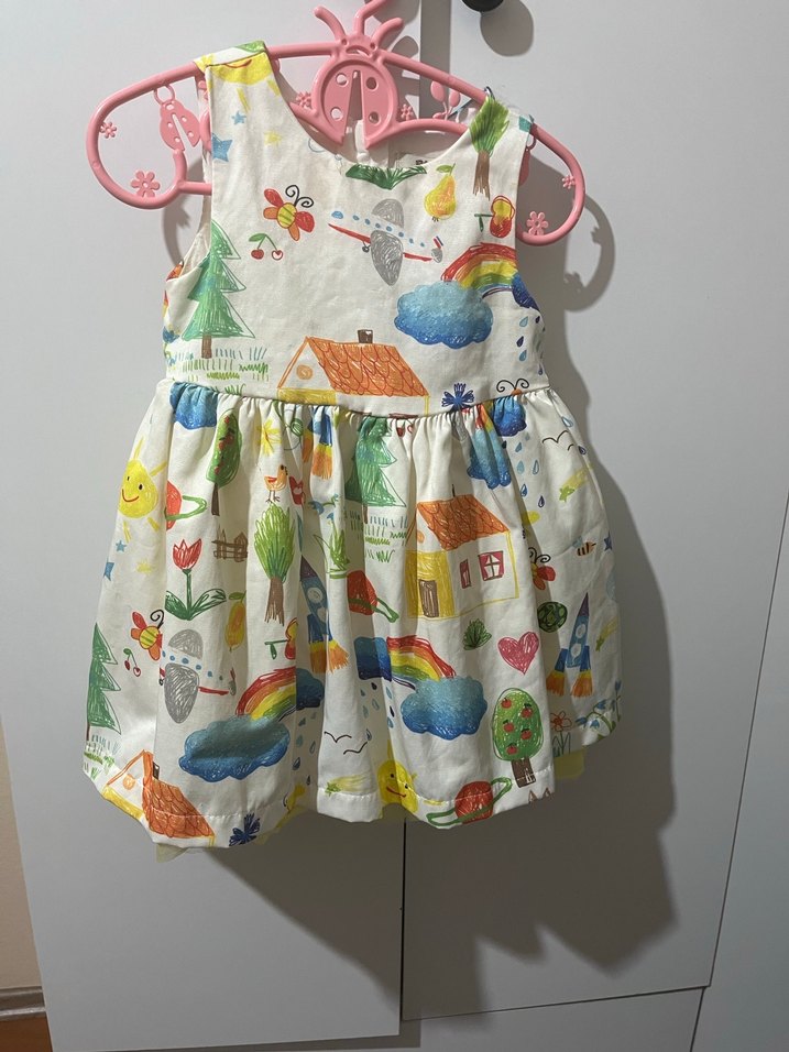 Renkli baskılı, bohem tarzda, kolsuz ve salaş kesim kız elbisesi. Askısız yakası ve fırfır detaylarıyla neşeli bir görünüm sunar.