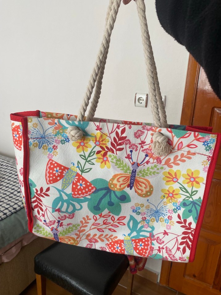 Renkli çiçek ve kelebek desenli, sentetik kumaş, fermuarlı bohem plaj çantası. Günlük kullanım için uygun, sağlam ip saplı. Dolapta öyle duruyor kullanılmadı