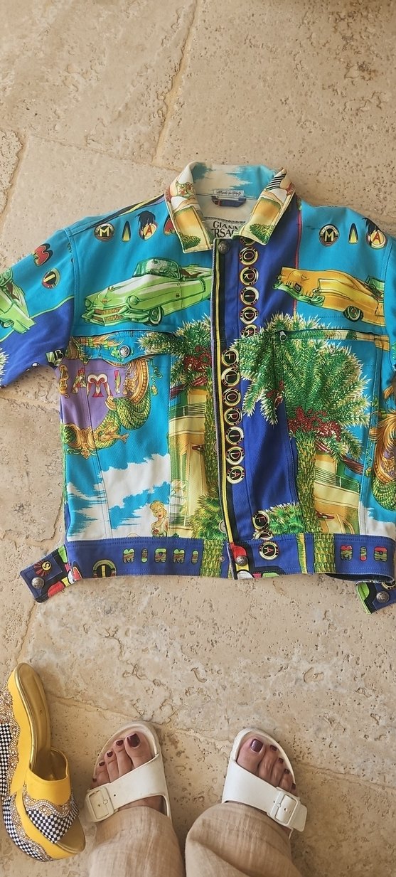 Renkli baskılı, bol kesim erkek ceket. Notlu yakalı ve düğmeli, tekstil kumaştan yapılmıştır. Pop kültür desenleriyle dikkat çeker. versacenin gelenekselleşmiş motifiyle bezenmiştir orijinalini 37000 tl