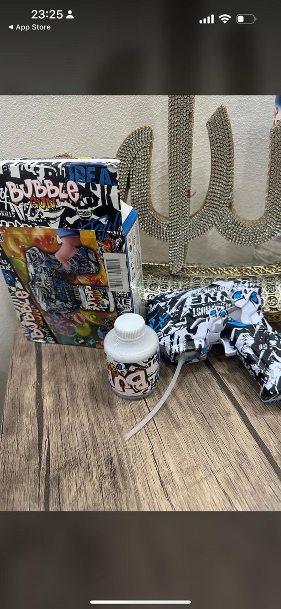 Renkli baskılı, plastik malzemeden yapılmış boncuklu baloncuk tabancası. İçinde baloncuk sıvısı da bulunur.