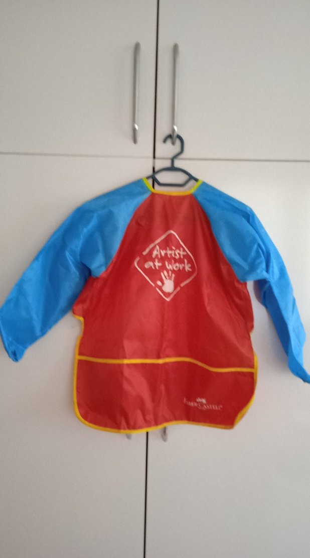Uzun kollu, baskılı, kırmızı gövdeli ve mavi kollu renkli boyama önlüğü. Üzerinde "Artist at work" yazısı bulunur. ️