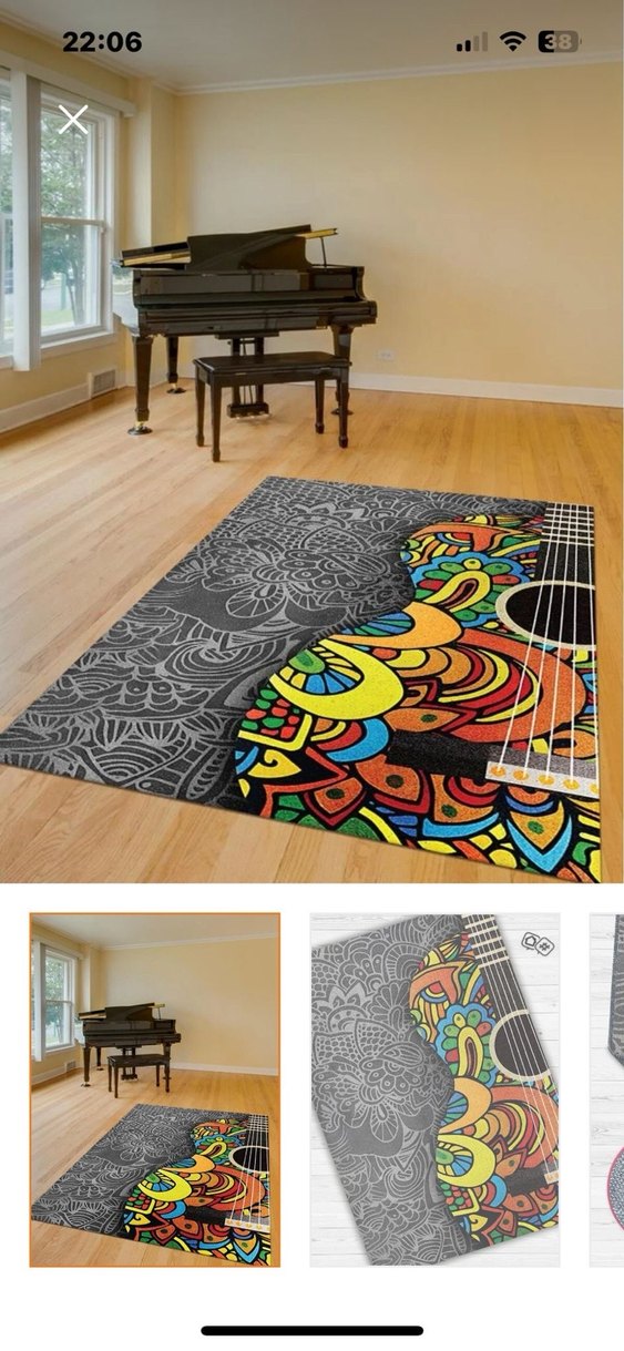 Bu çağdaş halı, desenli gri zemin üzerinde canlı renkli gitar figürü ile renkli baskılı tasarım sunar, her odaya sanatsal bir dokunuş katar.