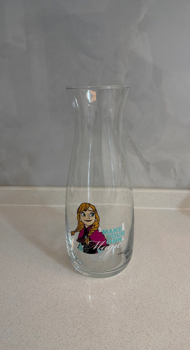 Renkli bir çizgi karakter ve "Make Your Own Magic" yazısı bulunan bej cam vazo. Mekâna eğlenceli bir dokunuş katar.