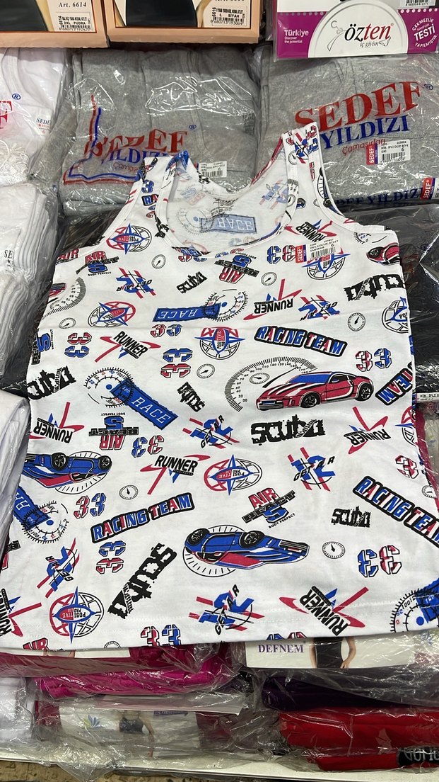 Renkli baskılı çocuk atlet, yarış arabası ve yazı desenleriyle dikkat çeker. Rahat ve canlı bir tasarıma sahiptir. ️