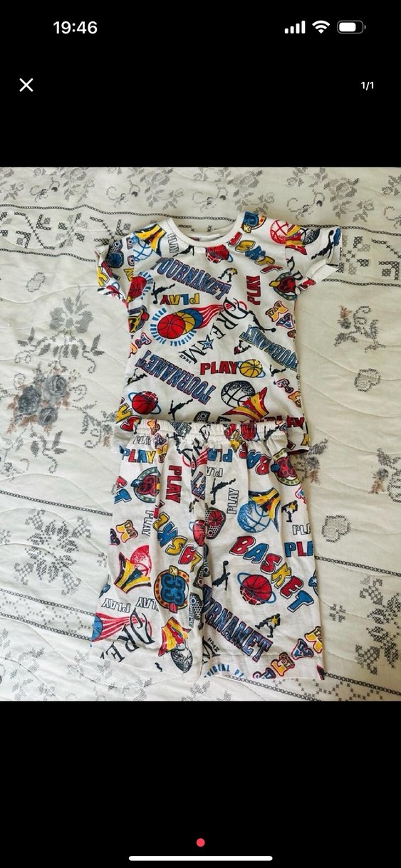Renkli baskılı tasarıma sahip çocuk atlet ve şort takımı, yumuşak ve rahat kumaştan üretilmiştir. Spor temalı canlı desenler içerir.
