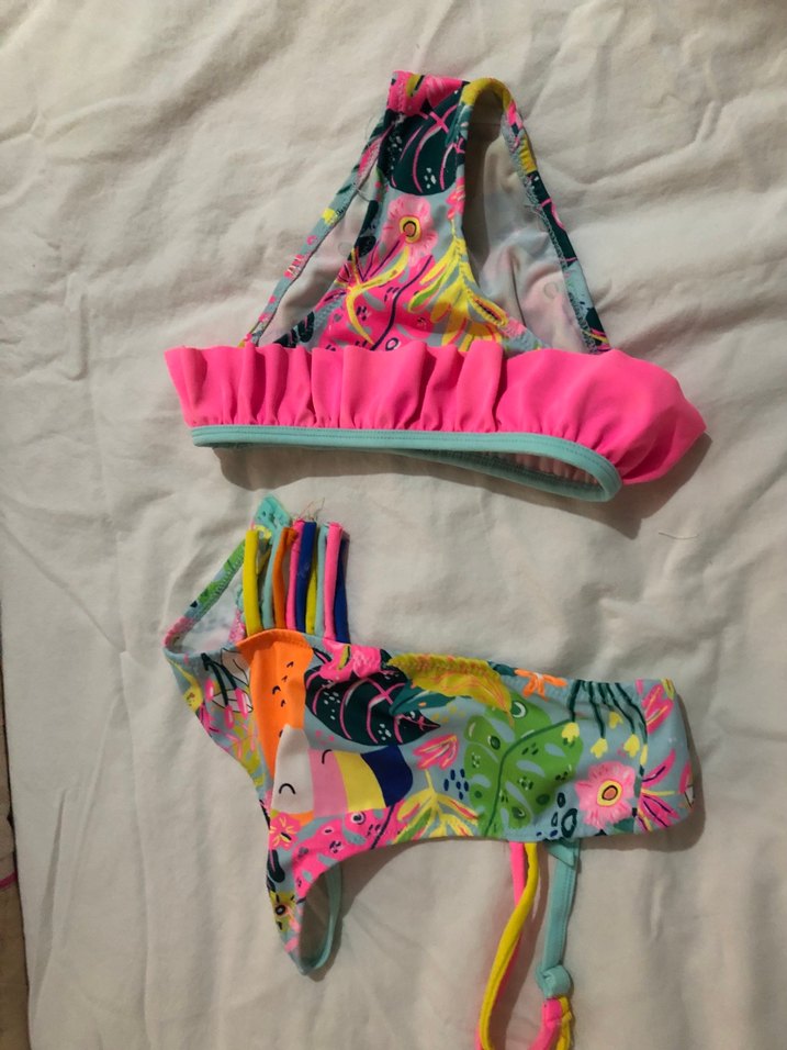 Canlı renklerde, baskılı ve ince askılı kız çocuk bikini takımı, plaj için uygun.
