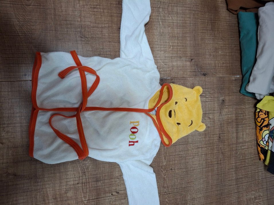 Renkli baskılı çocuk bornozu, Pooh yüzü şeklinde kapüşon ve önünde 'pooh' nakışı ile yumuşak kumaştan üretilmiştir. Turuncu şerit ve kemer bulunur.